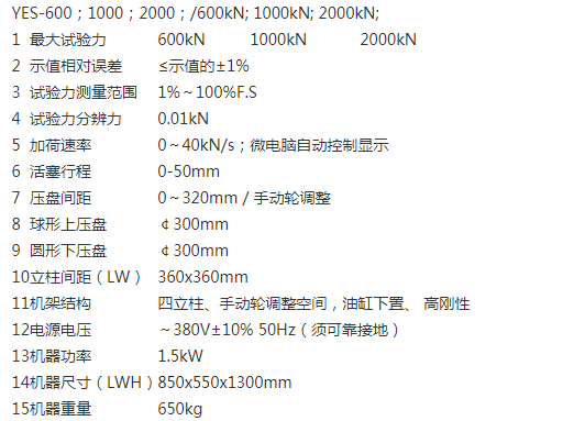 產(chǎn)品規(guī)格 YES-600;1000;2000;600kN;1000kN;;2000kN;YES系列經(jīng)濟(jì)型數(shù)顯式壓力試驗機(jī)